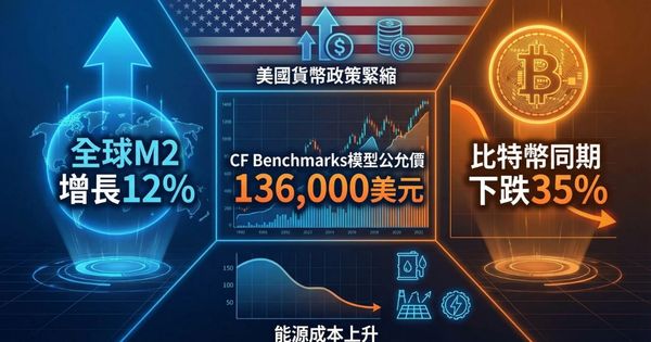 2026-03-24比特幣流動性失靈?自2025年中以來,全球M2貨幣供應量增長約12%,而比特幣同期下跌約35%,創下有記錄以來最大的脫鉤之一。CF Benchmarks模型顯示,根據歷史流動性關係,比特幣的「公允價值」約為136,000美元,與當前70,000美元附近價格形成巨大落差。分析師指出,美國貨幣政策緊縮與能源成本上升,是解釋此脫鉤的關鍵因素。